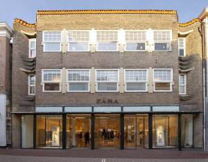 De brede gevel van het winkelpand is geplaatst voor twee in oorsprong middeleeuwse panden.